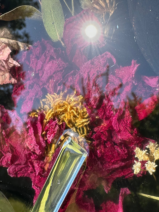 Horloge murale artisanale en résine avec les fleurs séchées.
