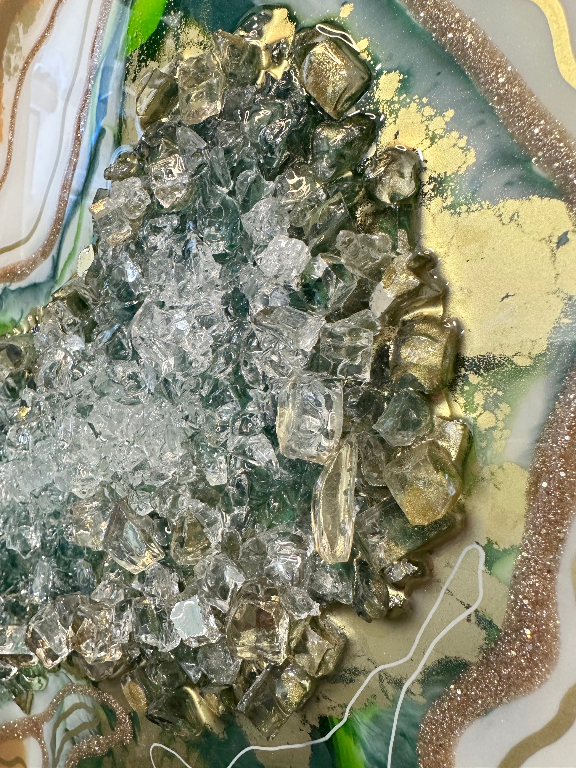 Les verres brisés utilisés ne sont pas des pierres naturelles, mais des éléments décoratifs en verre, travaillés pour créer un effet minéral, proche des géodes et des formations rocheuses. Ils apportent relief, lumière et texture à l’œuvre, tout en garantissant une finition élégante et contemporaine.