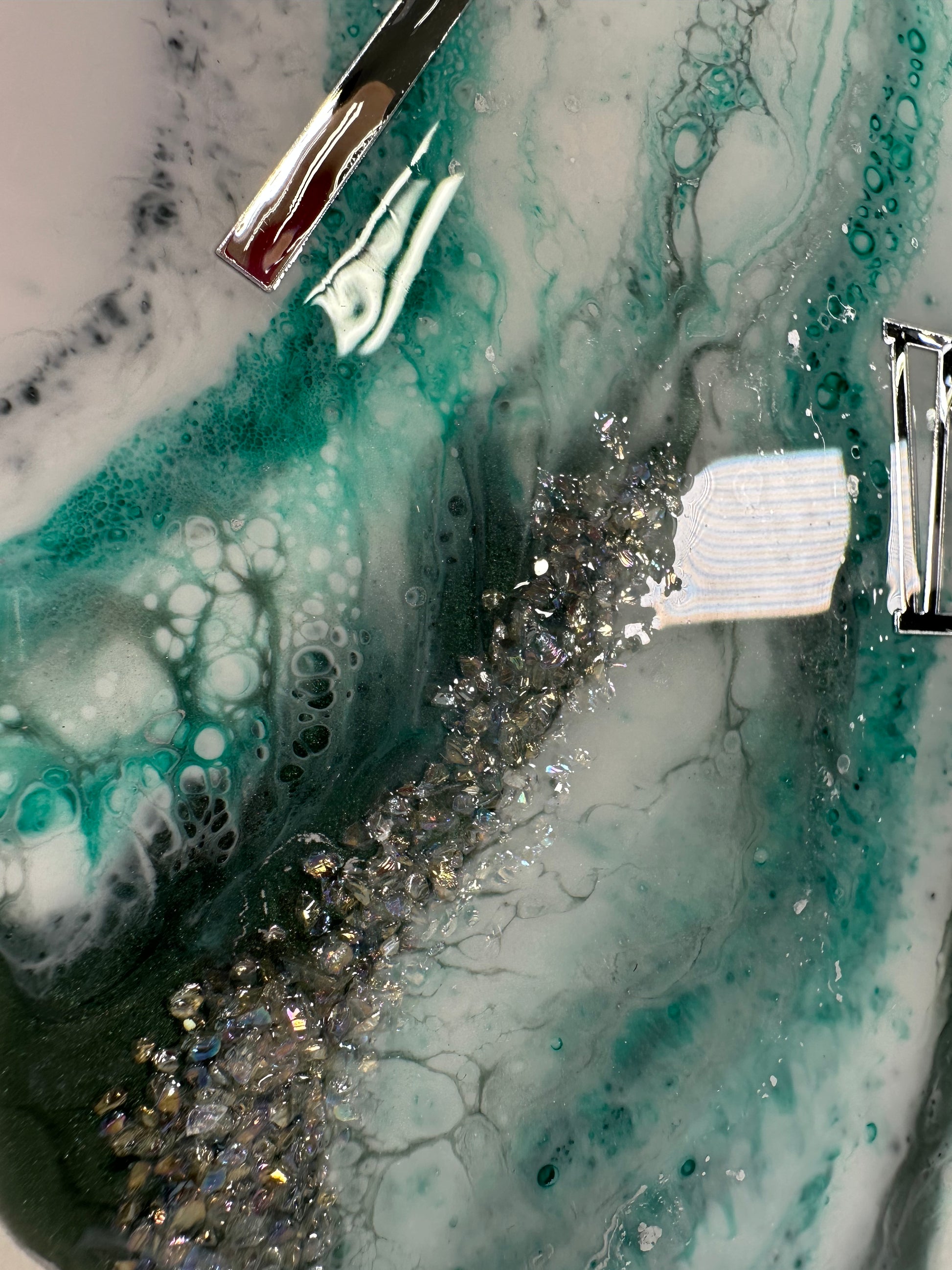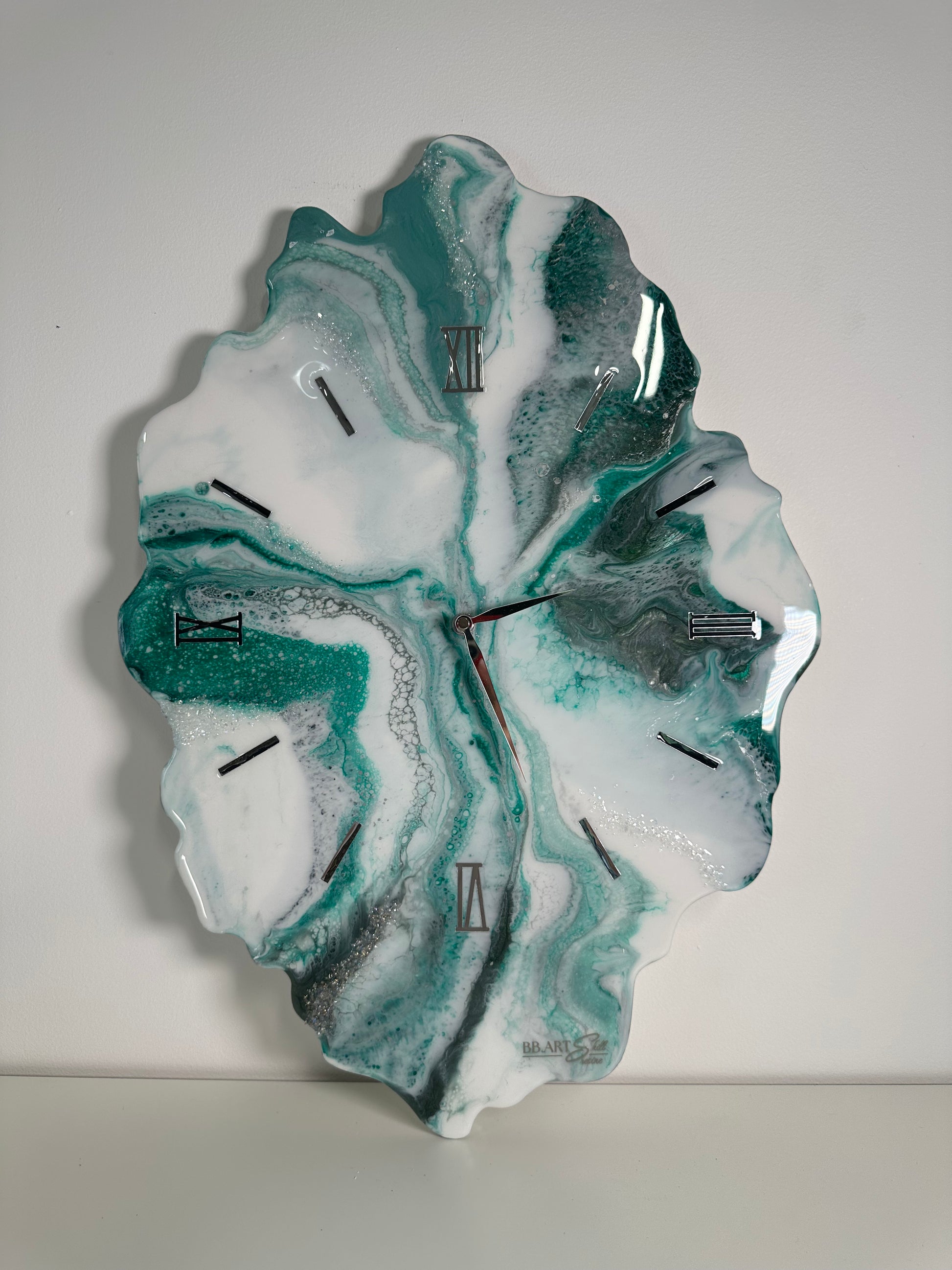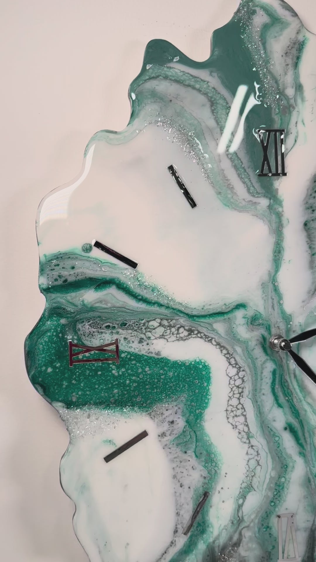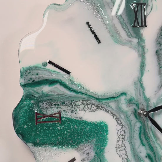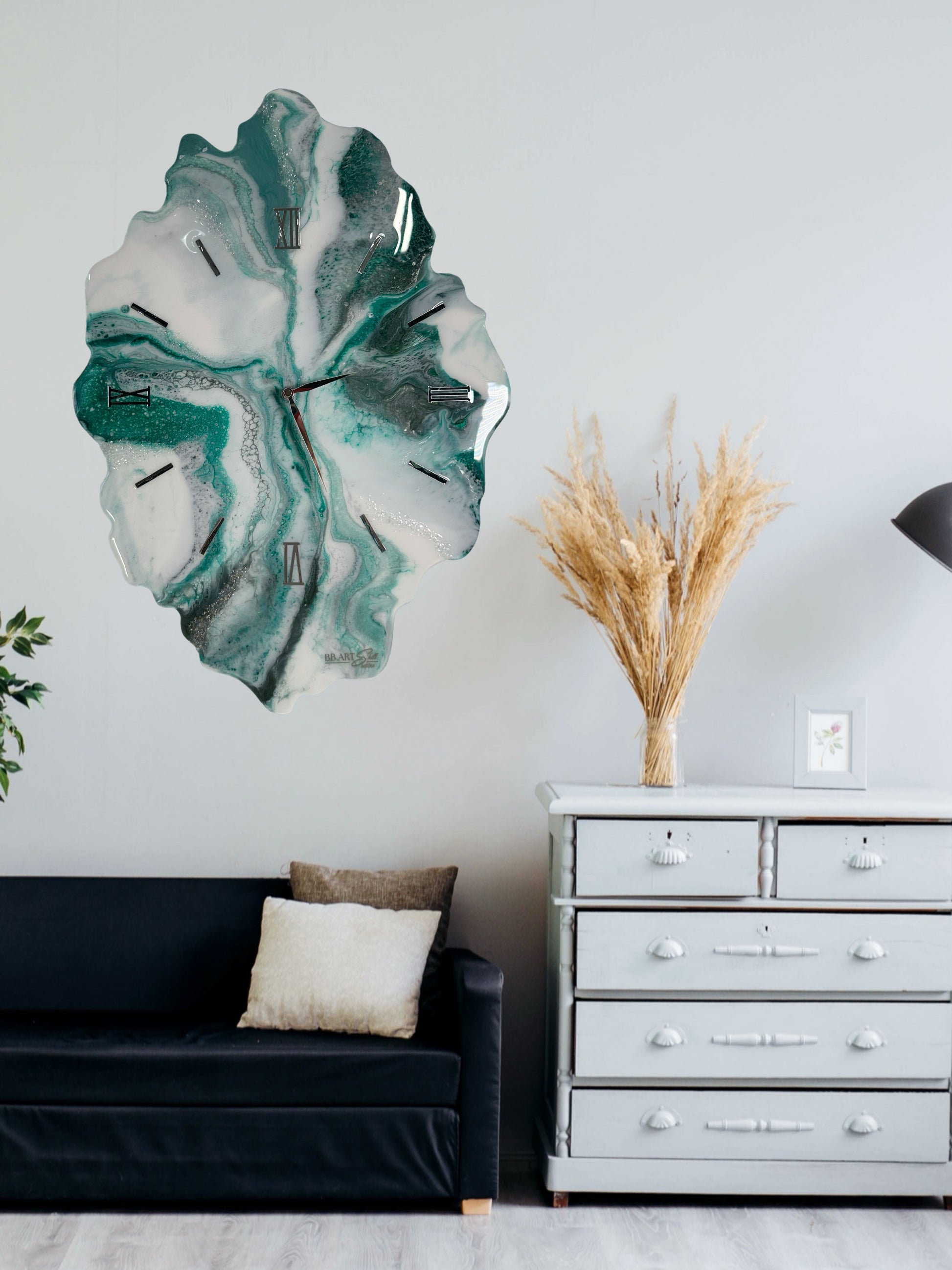 La beauté du vert est sublimée par l'ajout de pierres naturelles dans cette horloge murale unique.