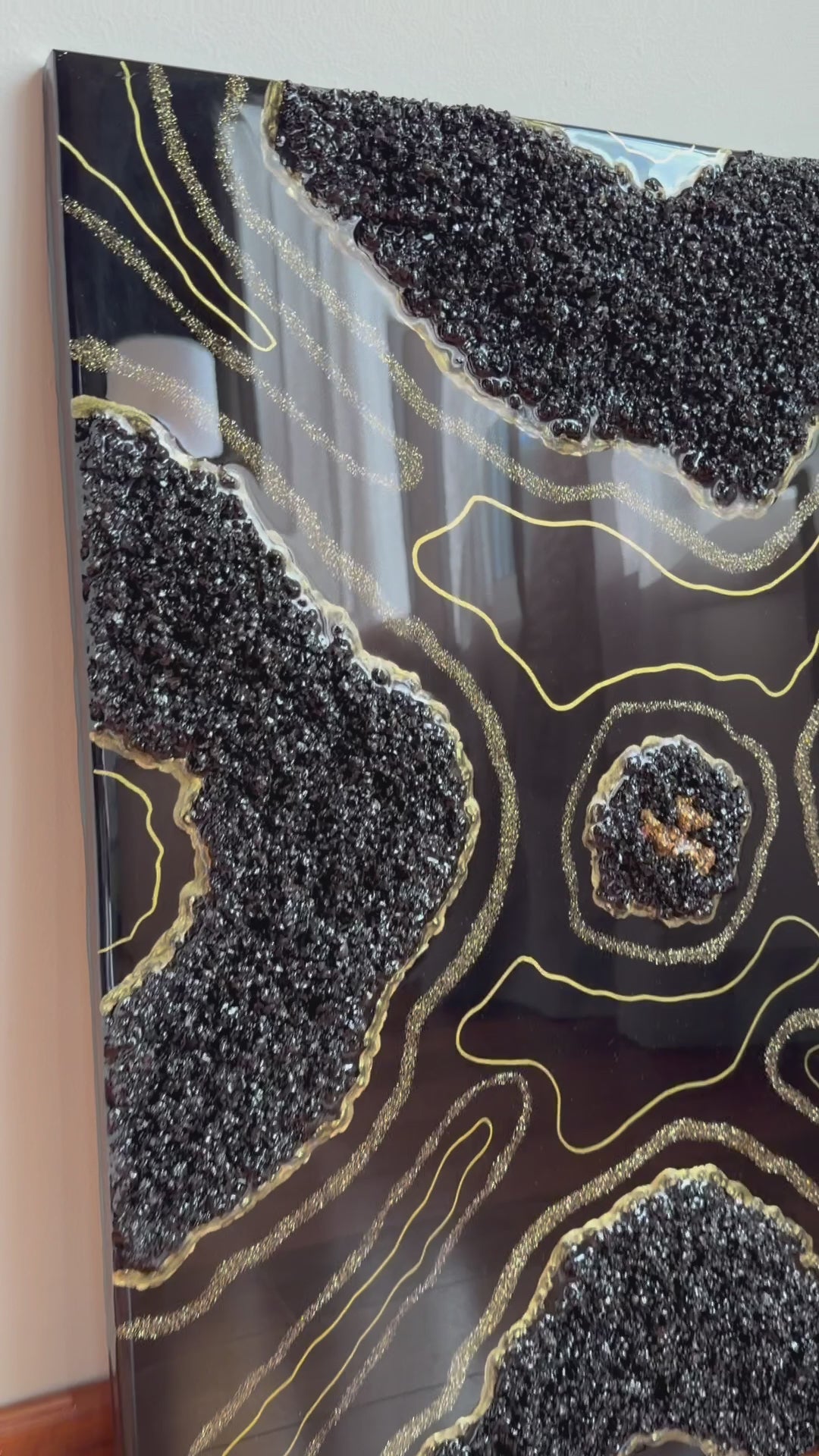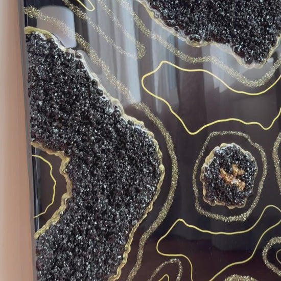 Le travail de matière en relief, combiné à la résine époxy, crée une profondeur visuelle élégante et durable. Les contrastes entre le noir profond, le doré minéral de la pyrite et les nuances de quartzite donnent à ce tableau mural une présence forte, tout en restant raffinée et intemporelle.